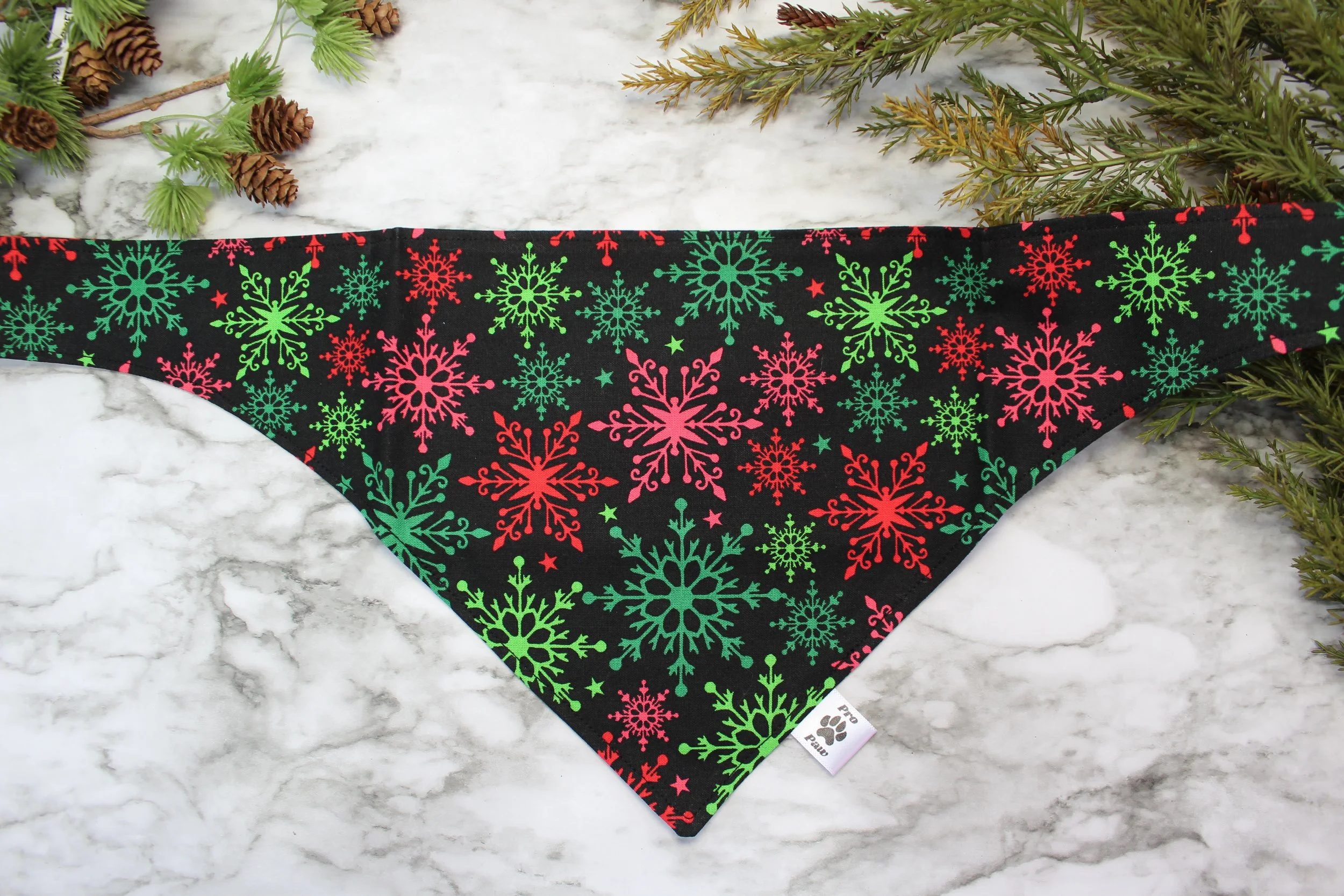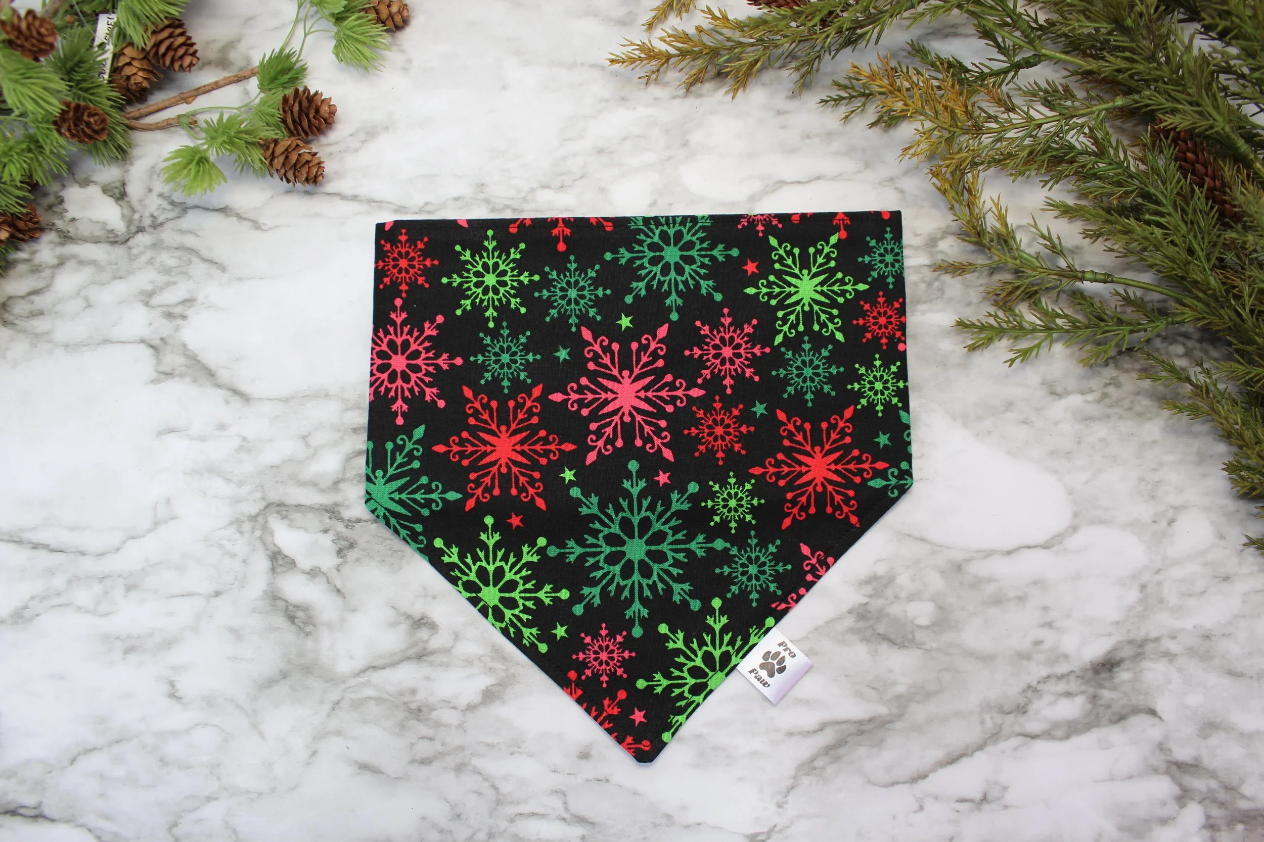 Get your pup ready for the holiday season with this vibrant snowflake-patterned dog bandana! Featuring a cheerful design of red and green snowflakes against a sleek black background, this bandana adds a festive touch to your furry friend’s wardrobe. Perfect for holiday parties, photo sessions, or everyday wear, it’s a stylish and comfortable accessory for any pet.